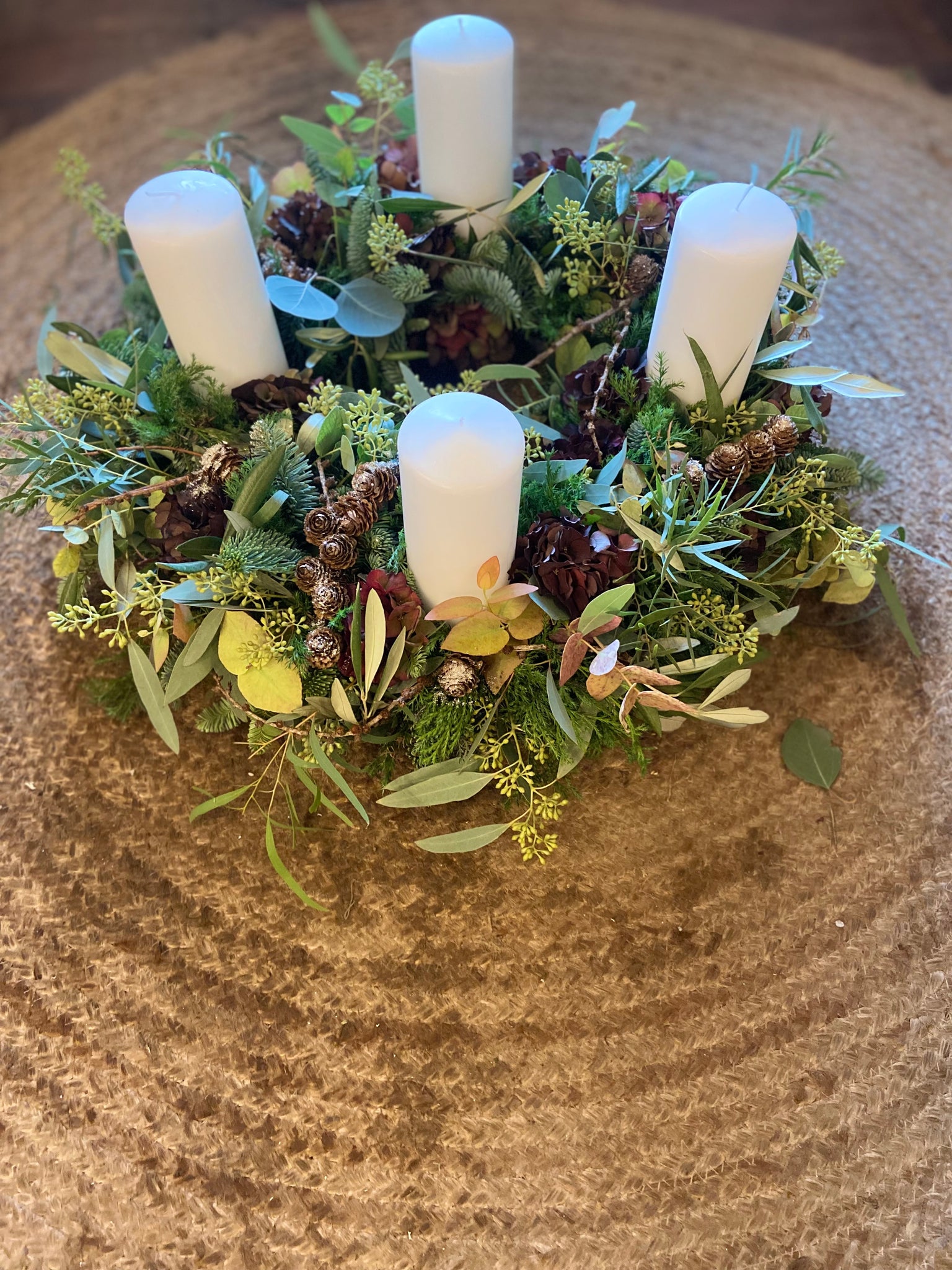 Efter jul kan kransen bruges med et bloklys i mindten som vinterdekoration på bordet.