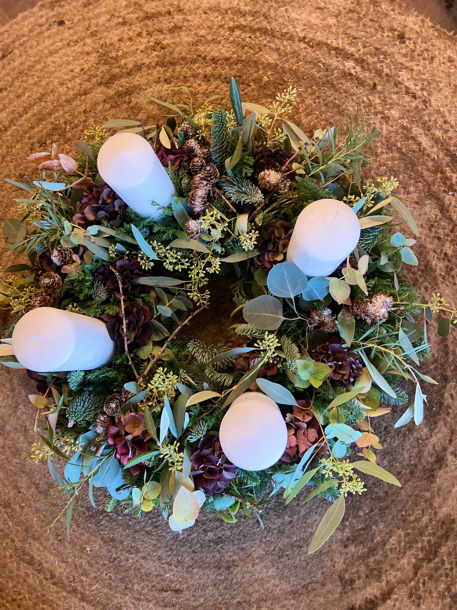 Adventskrans i oasiskrans, ca. 50cm i dia. Som holder blomsterne friske i lang tid. Forskelligt grønt som ikke drysser, og med flotte husløg. Adventskransen er beregnet til bloklys. Den skal stilles på et fad/stor tallerken, og kan nemt vandes ugeligt for at holde blomsterne friske.