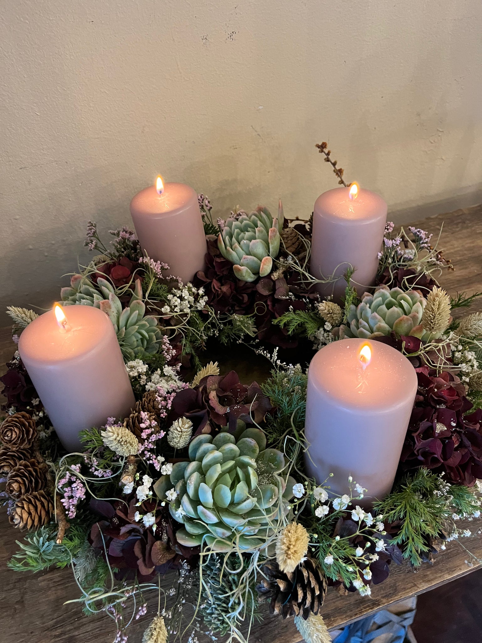 Adventskrans i oasiskrans, ca. 40cmi dia. Som holder blomsterne friske i lang tid. Forskelligt grønt som ikke drysser, og med flotte husløg. Adventskransen er beregnet til bloklys. Den skal stilles på et fad/stor tallerken, og kan nemt vandes ugeligt for at holde blomsterne friske.