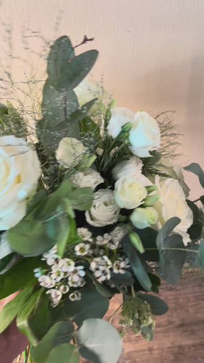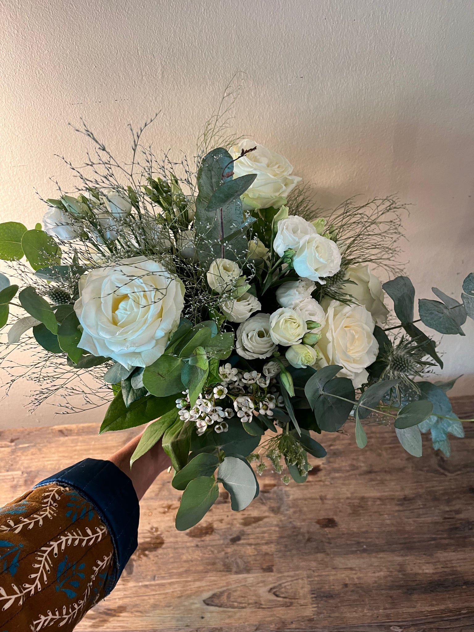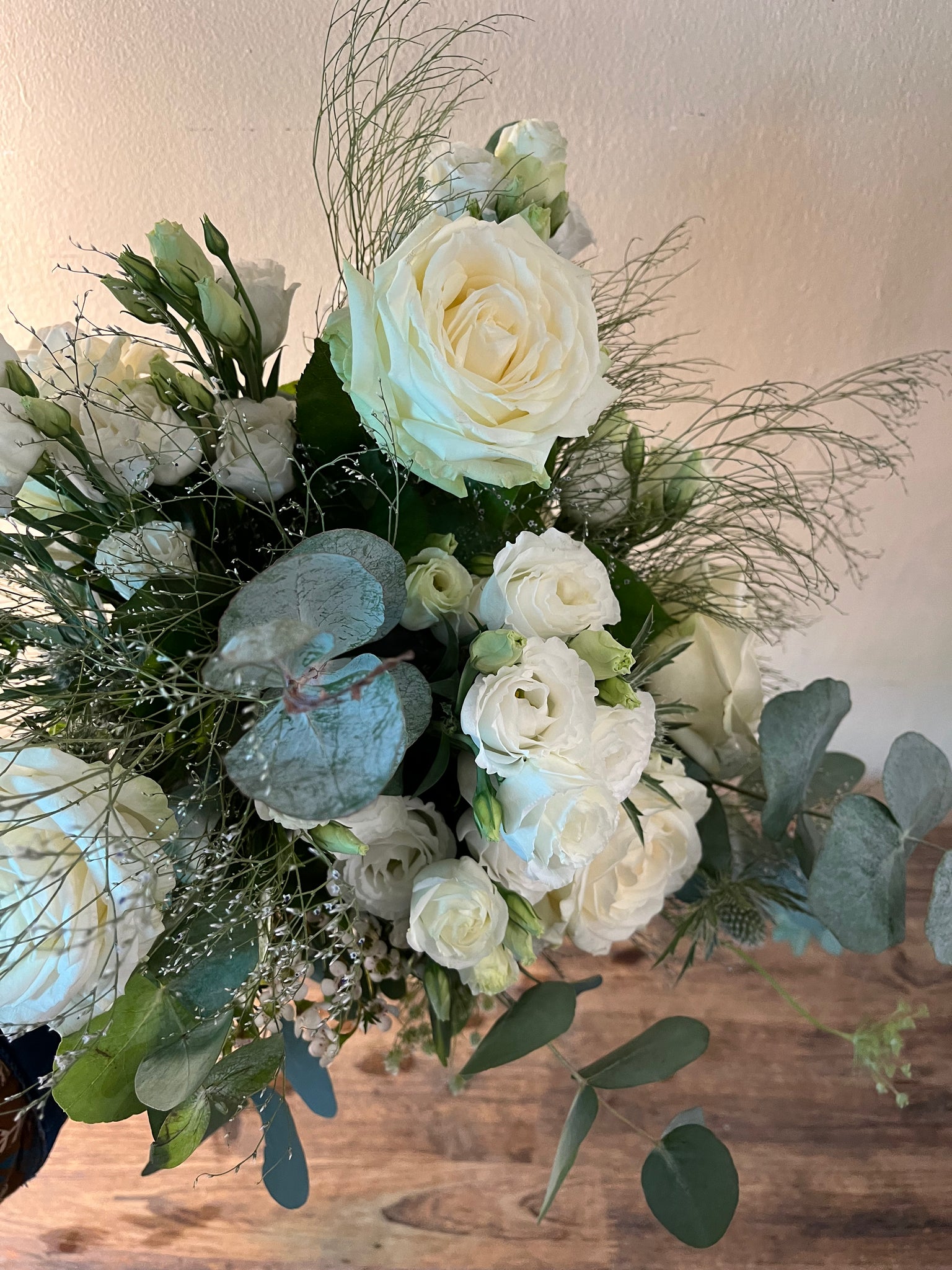 En buket bundet i en let vifteform, der emmer af elegance og ynde. De friske blomster i hvide nuancer som skaber et romantisk og harmonisk udtryk – perfekt som gave, fejring eller bare fordi.