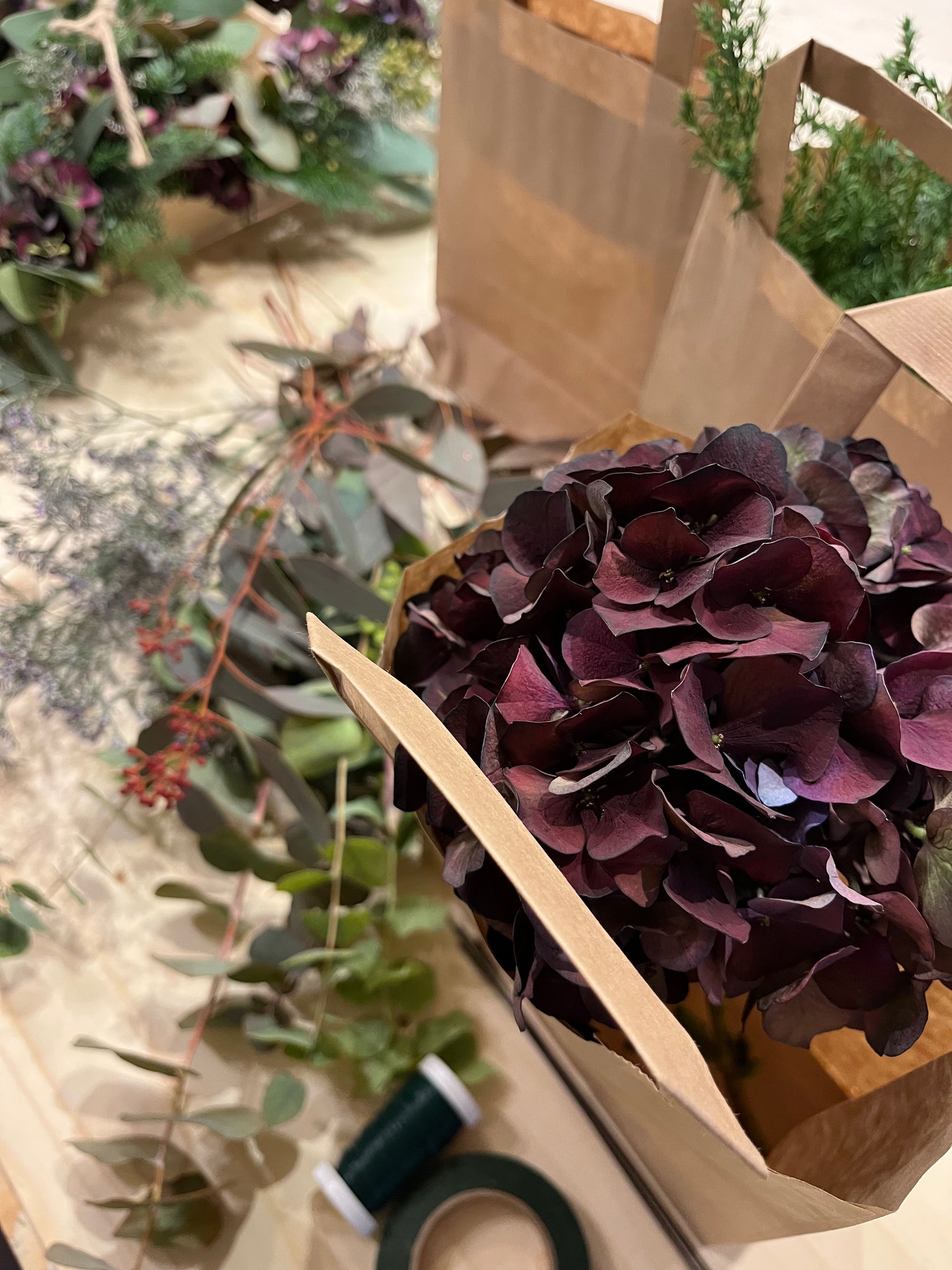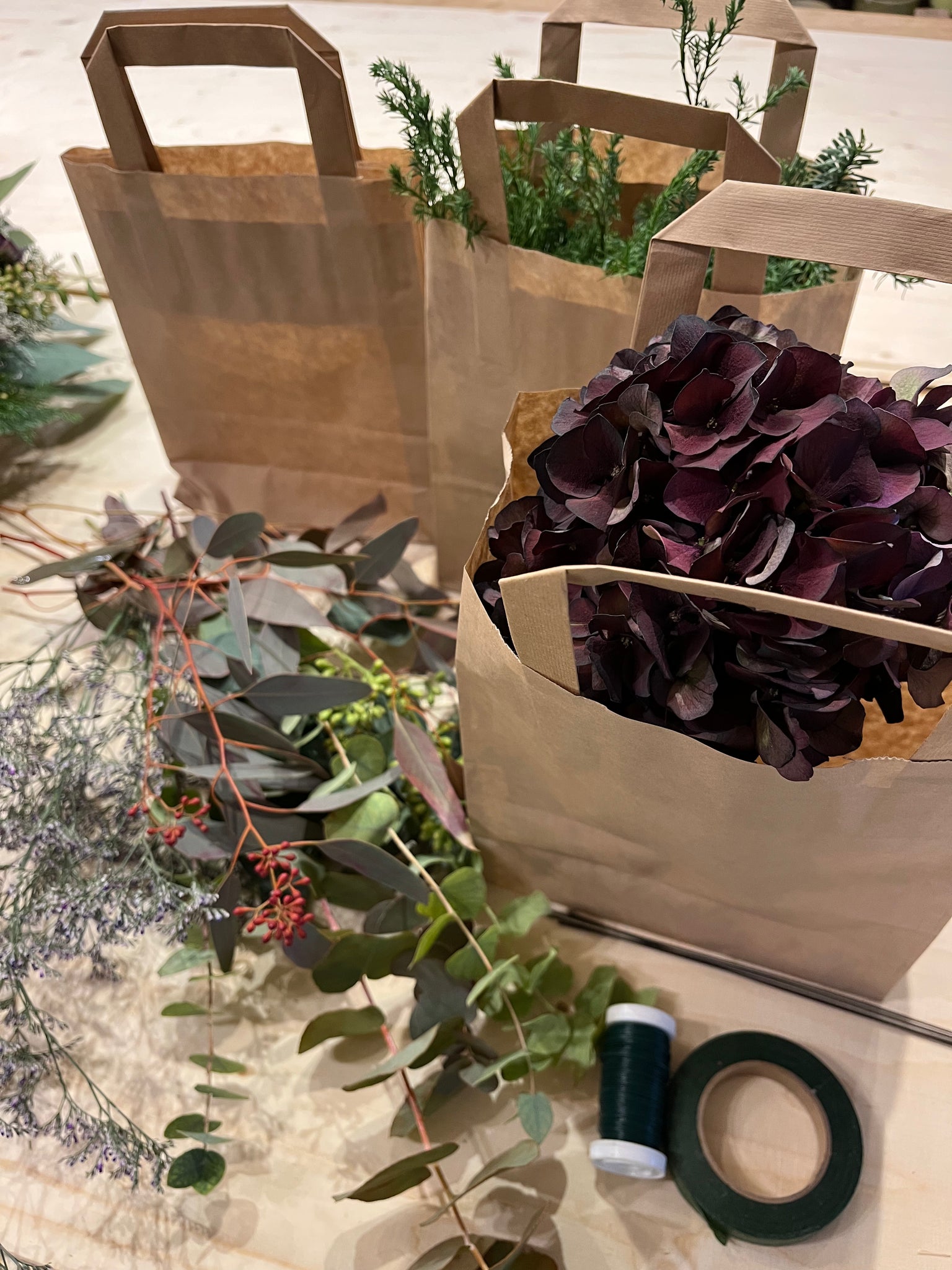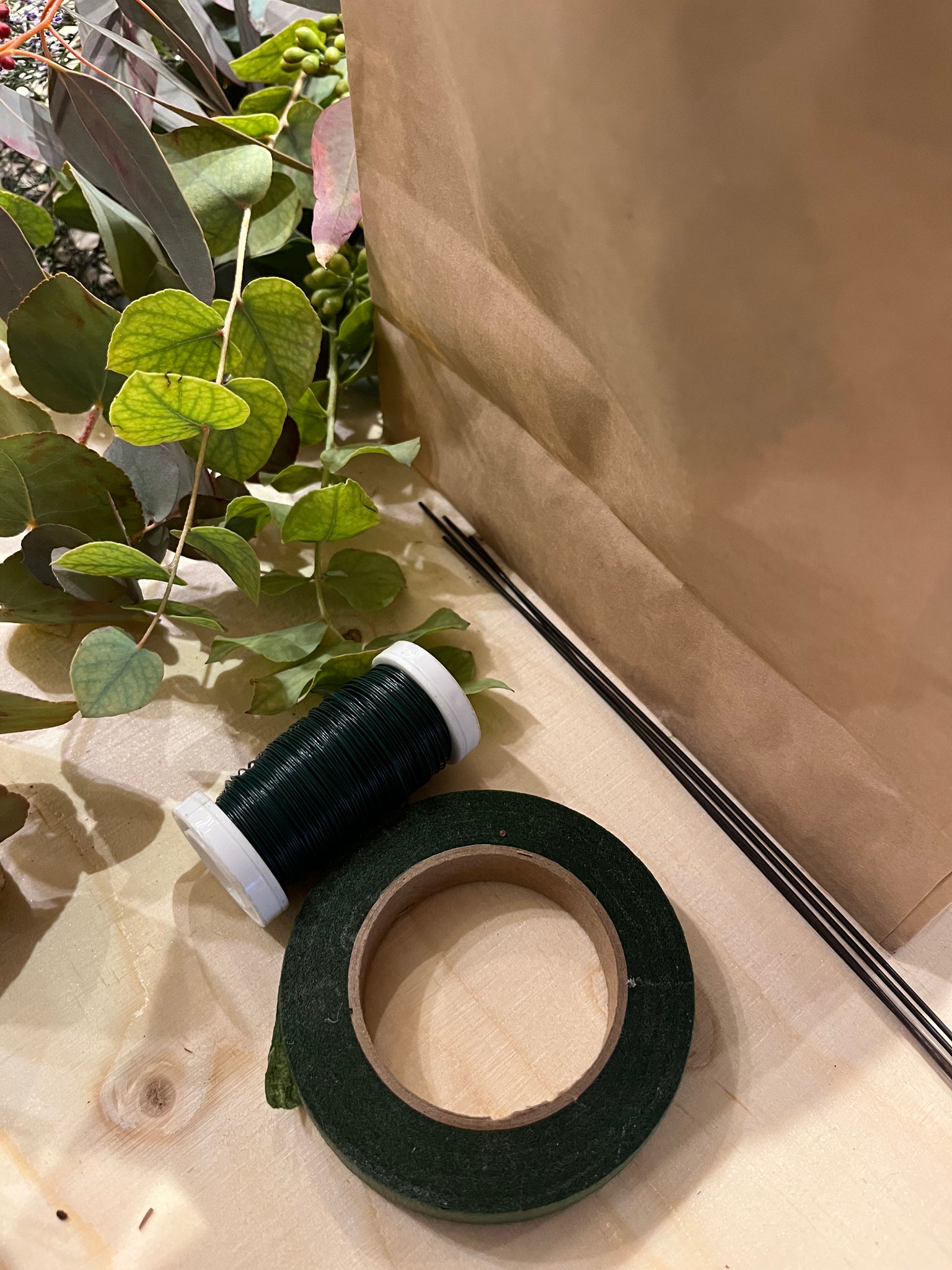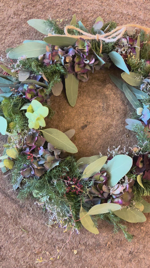 Du skal selv lave din ring af ståltråd og derefter klippe materialer op i mindre stykker som du binder rundt on kransen i små buketter. Du får både tråd og blomstertape med i kassen.