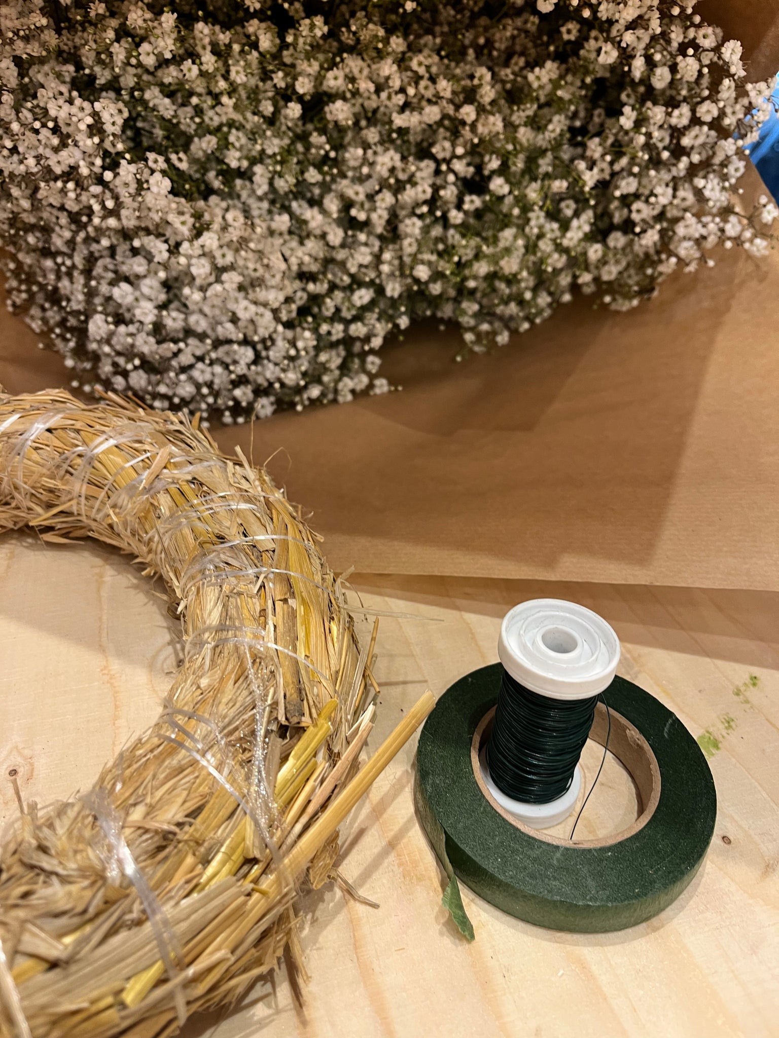 Du skal selv klippe materialer op i mindre stykker som du binder rundt on kransen i små buketter. Du får både tråd med i kassen.
