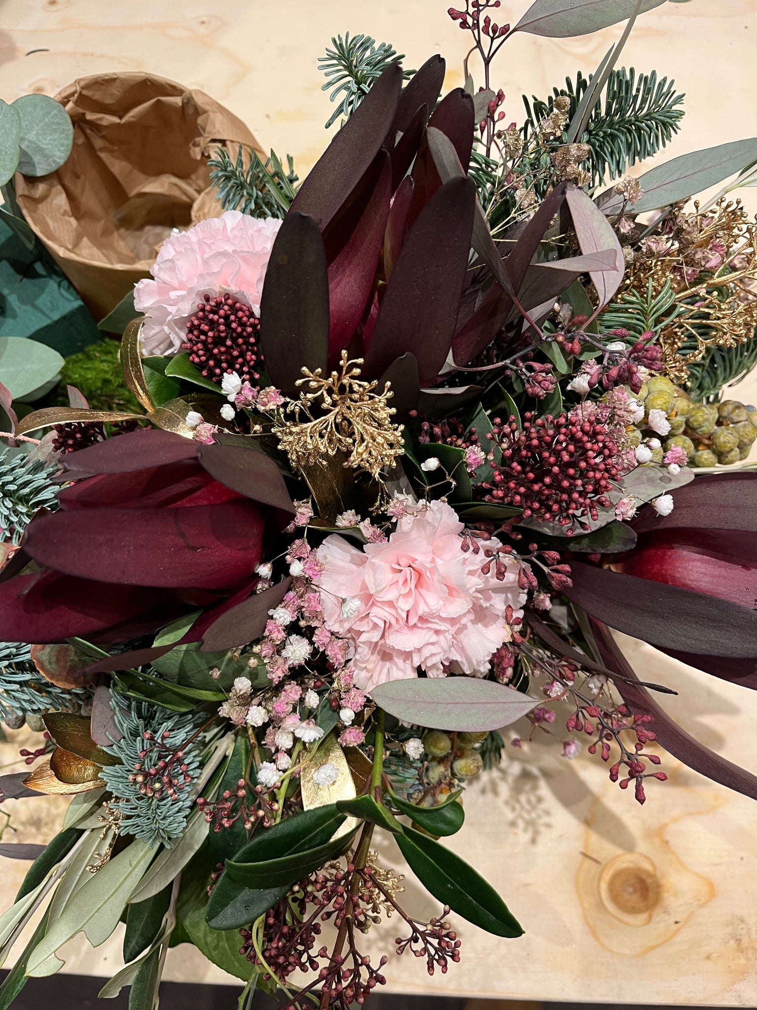 Du får en masse dejlige grønne materialer og blomster leveret i en kasse sammen med en glasvase og oasis.