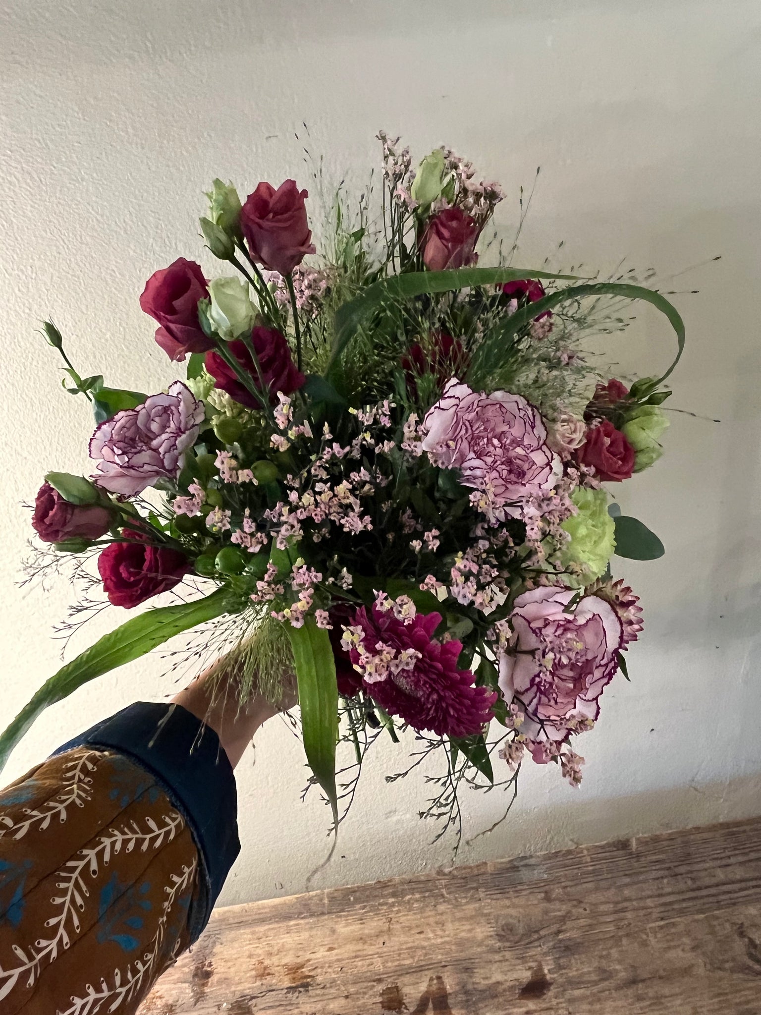 Blomsterbuket af friske blomster, smuk bundet i pink og rosa nuancer med grønt.
