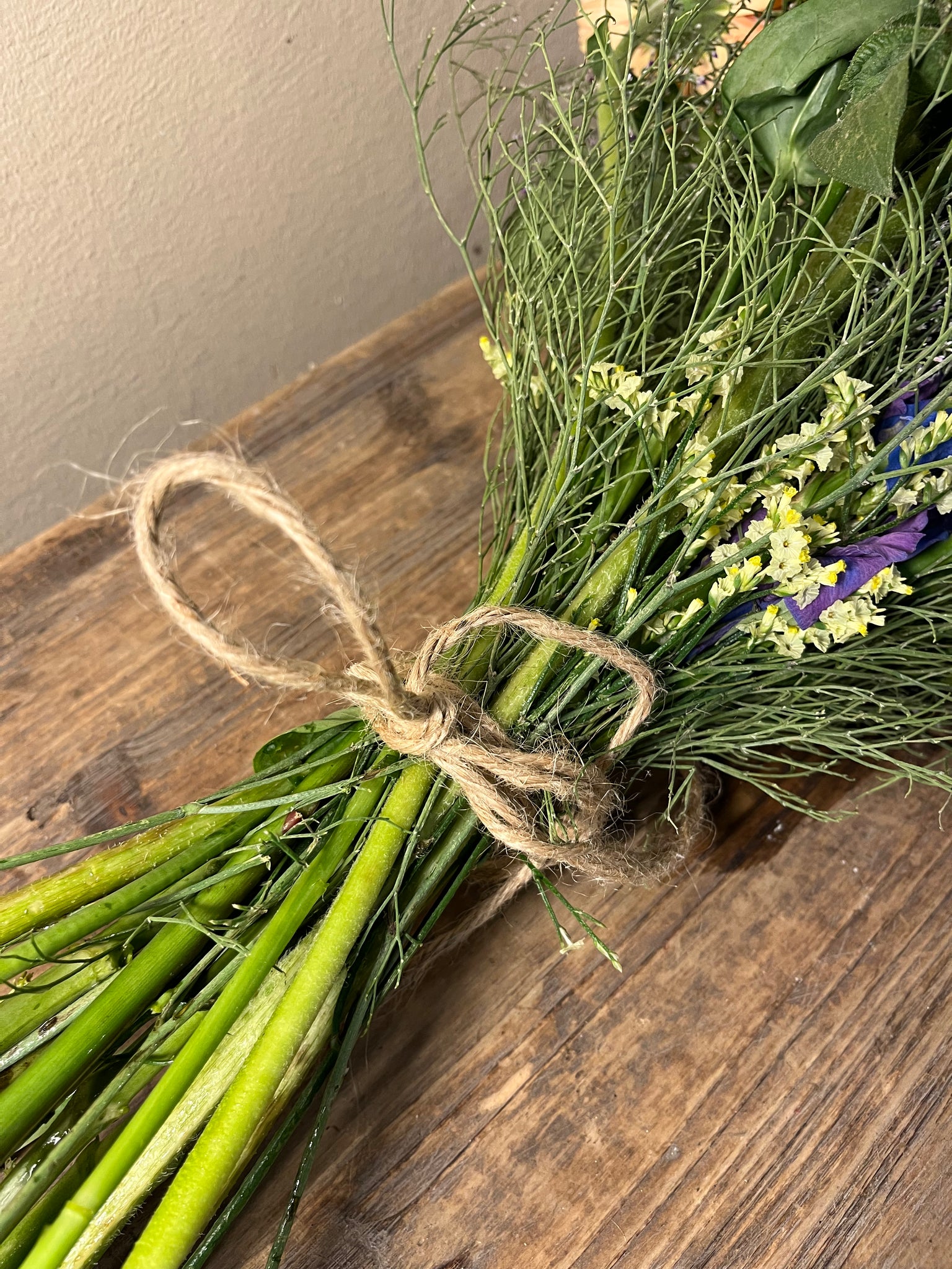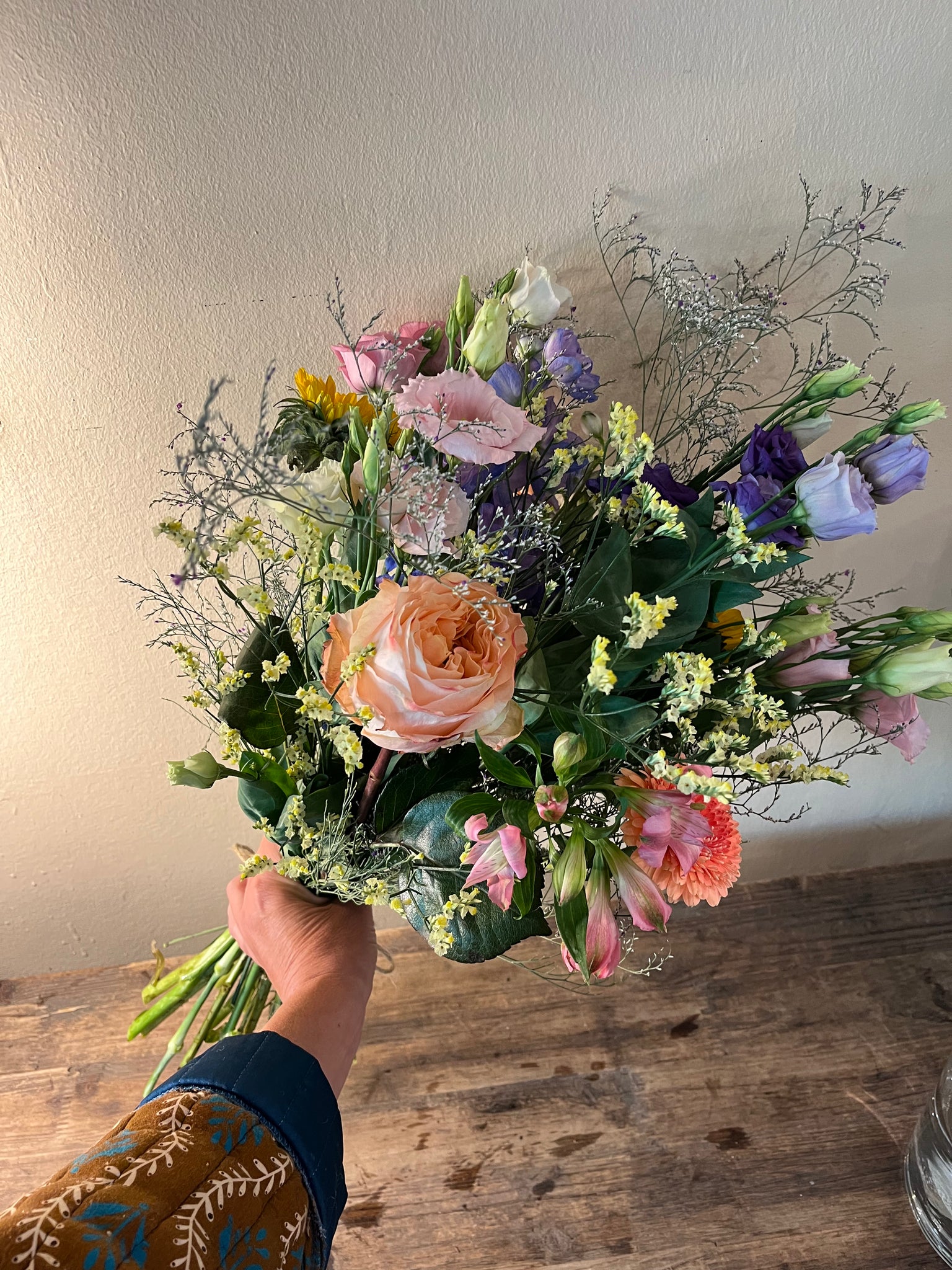 Blomsterbuket af friske blomster, smuk bundet i blandede farver, med grønt.